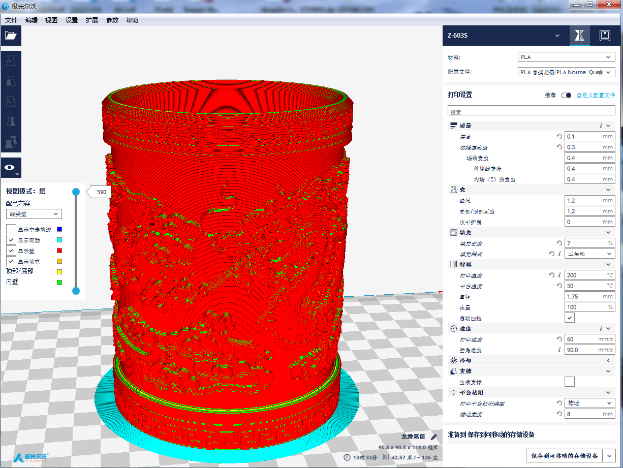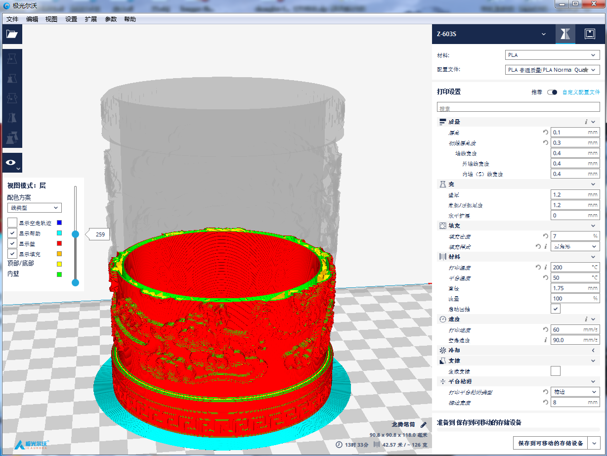 拖動(dòng)分層預(yù)覽滾動(dòng)條,軟件可以根據(jù)參數(shù)值,展現(xiàn)每一層的圖像。我們知道FDM打印技術(shù)原理,其實(shí)就是通過一層一層的材料堆積來實(shí)現(xiàn)整個(gè)模型的成型。通過預(yù)覽,你可以直觀地觀察到模型是怎樣一層一層生成的。