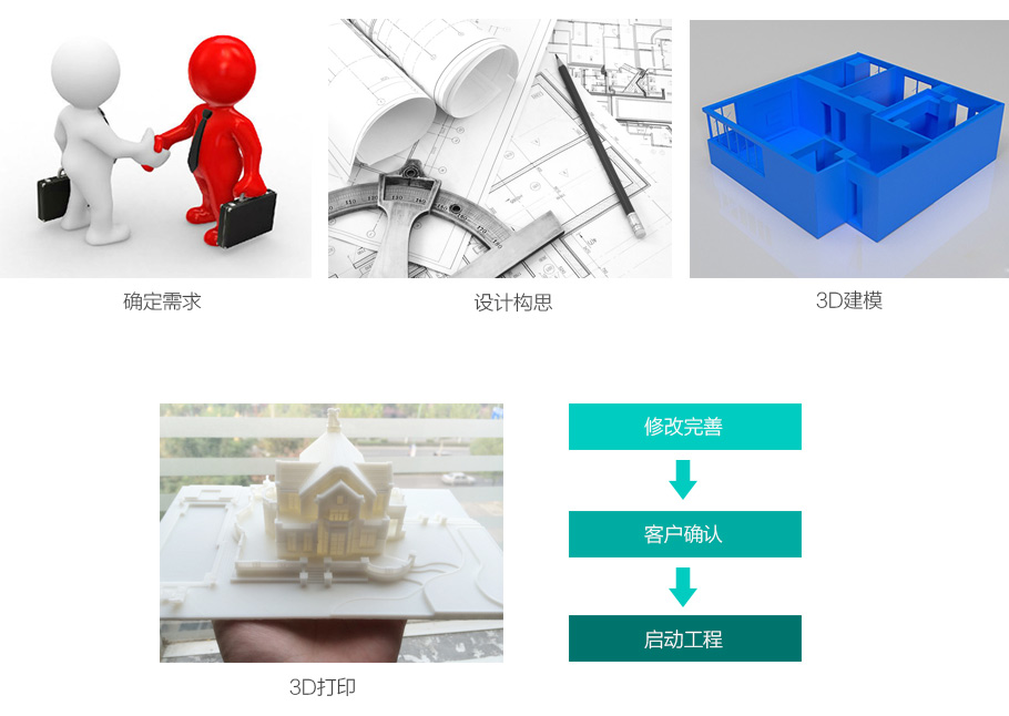 了解客戶需求→構(gòu)思設(shè)計(jì)→3D建模→3D打印出來→修改完善→客戶確認(rèn)→啟動(dòng)工程。